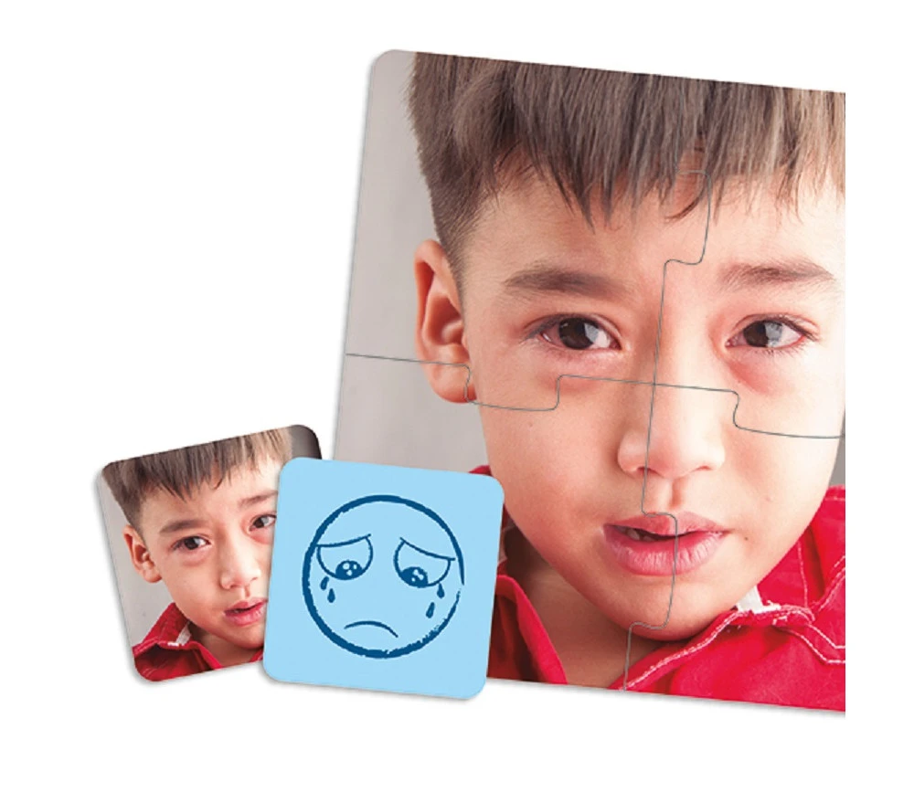 Jeu éducatif de qualité pour les enfants de 2 à 6 ans pour jouer à reconnaitre les expressions du visage : il faut assembler le puzzle et à l’aide de la fiche modèle, identifier l’émotion correspondante.