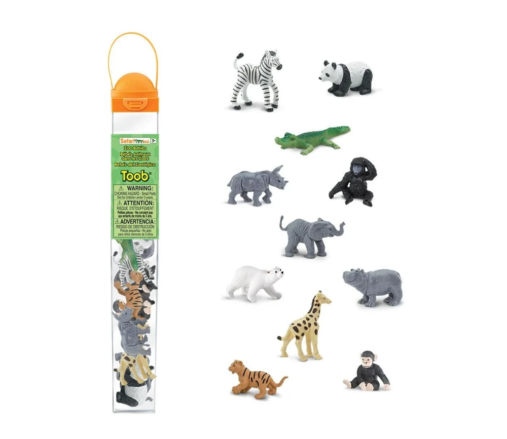1 zèbre (4.5 x 5 x 2.2 cm), 1 panda (5 x 2.5 x 2 cm), 1 tigre (5.5 x 3 x 2 cm), 1 hippopotame (5.5 x 3 x 2 cm), 1 crocodile (7 x 3.5 x 1.3 cm), 1 gorille (3.5 x 4 x 2.2 cm), 1 éléphant (6 x 3 x 2.5 cm), 1 singe (3.5 x 2.5 x 2.5 cm, 1 rhinocéros (5.5 x 3 x 2.5 cm), 1 ours polaire (6 x 3 x 2.5 cm), 1 girafe ( 6 x 4.5 x 1.8 cm).