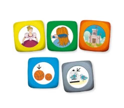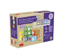 Jeu éducatif de dés avec images de contes classiques pour apprendre à construire des phrases. 90 pictogrammes de contes classiques comme Le lièvre et la tortue et Les Trois petits cochons, sont représentés sur les 15 dés.