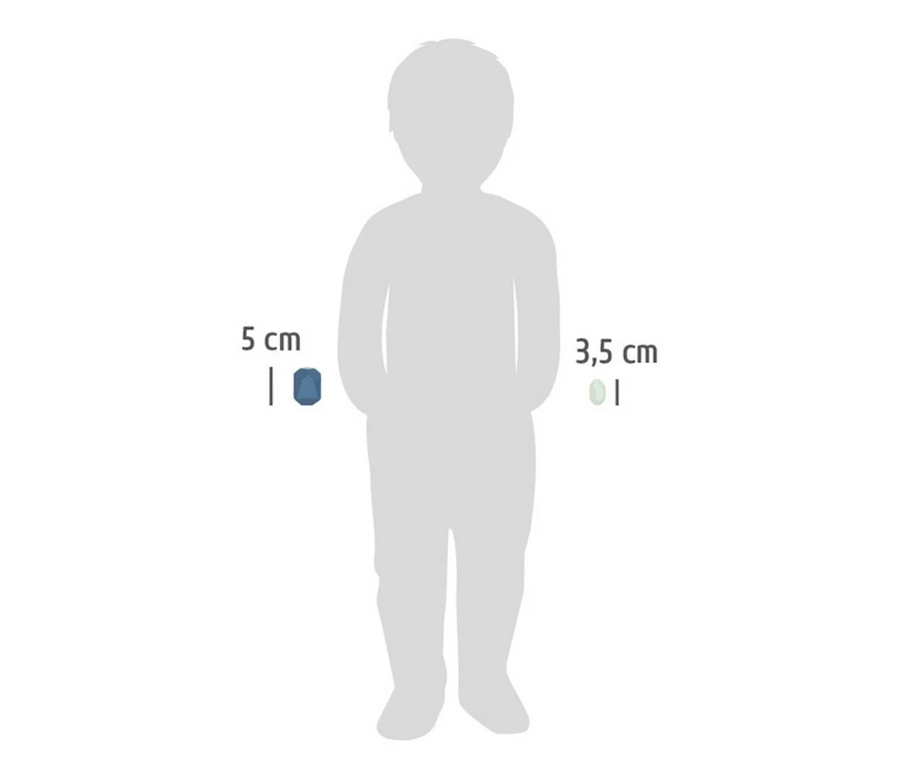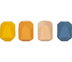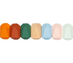 Ce set comprend 18 pièces en bois aux formes et couleurs variées. Différentes tailles plus grandes d’environ 4 x 3 x 5 cm et plus petites 2.5 x 2.5 x 3.5 cm.