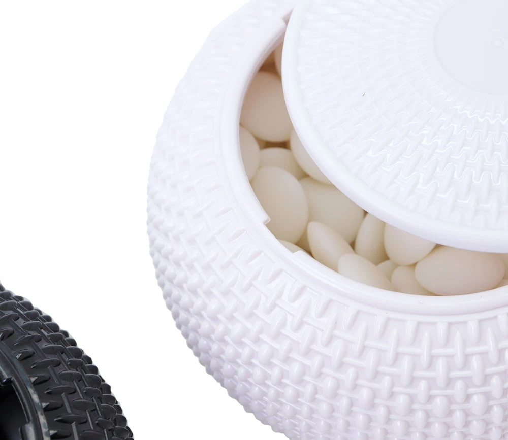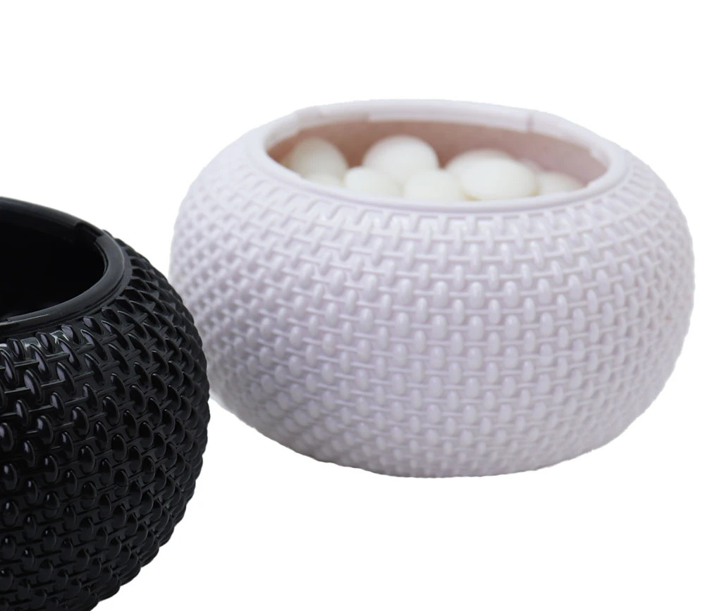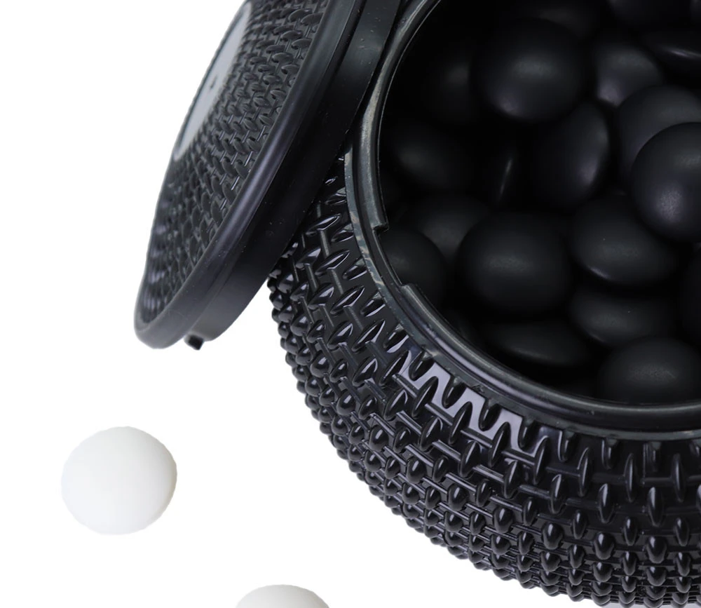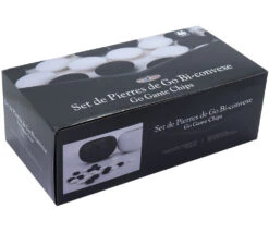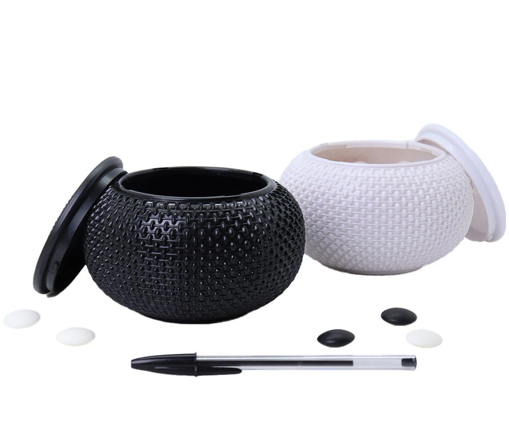 Le set de deux jarres et pions pour jeux de go bi-convexes est composé de deux bols en plastique et de plus ou moins 180 pierres blanches et plus ou moins 180 pierres noires.