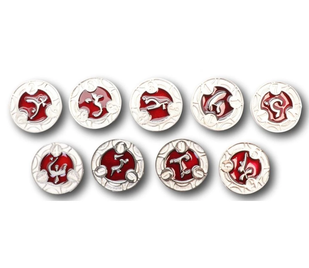 Set de 22 pièces en métal argenté avec deux faces gravées et une face avec inclusion d’émail rouge. 9 pièces de sorts différentes. Diamètre 27.2 mm. Epaisseur 3 mm. Poids d’une pièce entre 7.3 et 7.9 g.