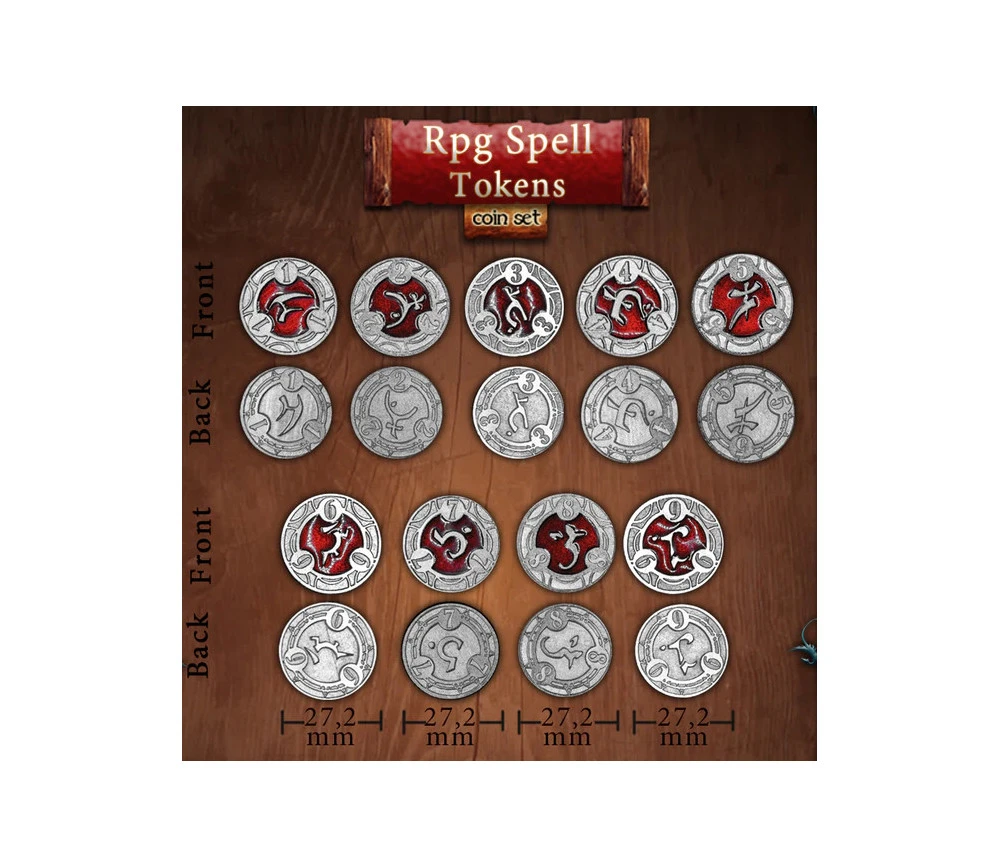 Ces pièces pour vos jeux sont en métal gravé sur les deux faces. Thème RPG Spell Tokens. Fabricant Drawlab.