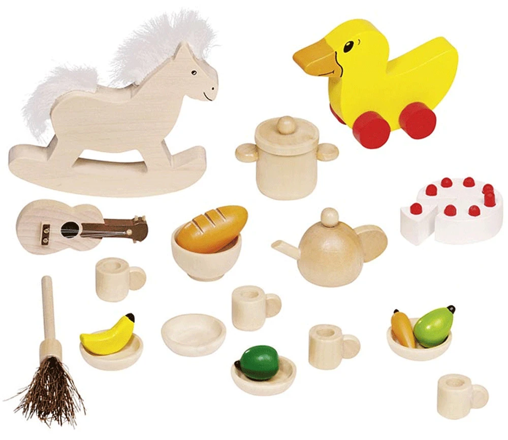 Jouets miniatures en bois teinté. Pièces de jeu de belle qualité.