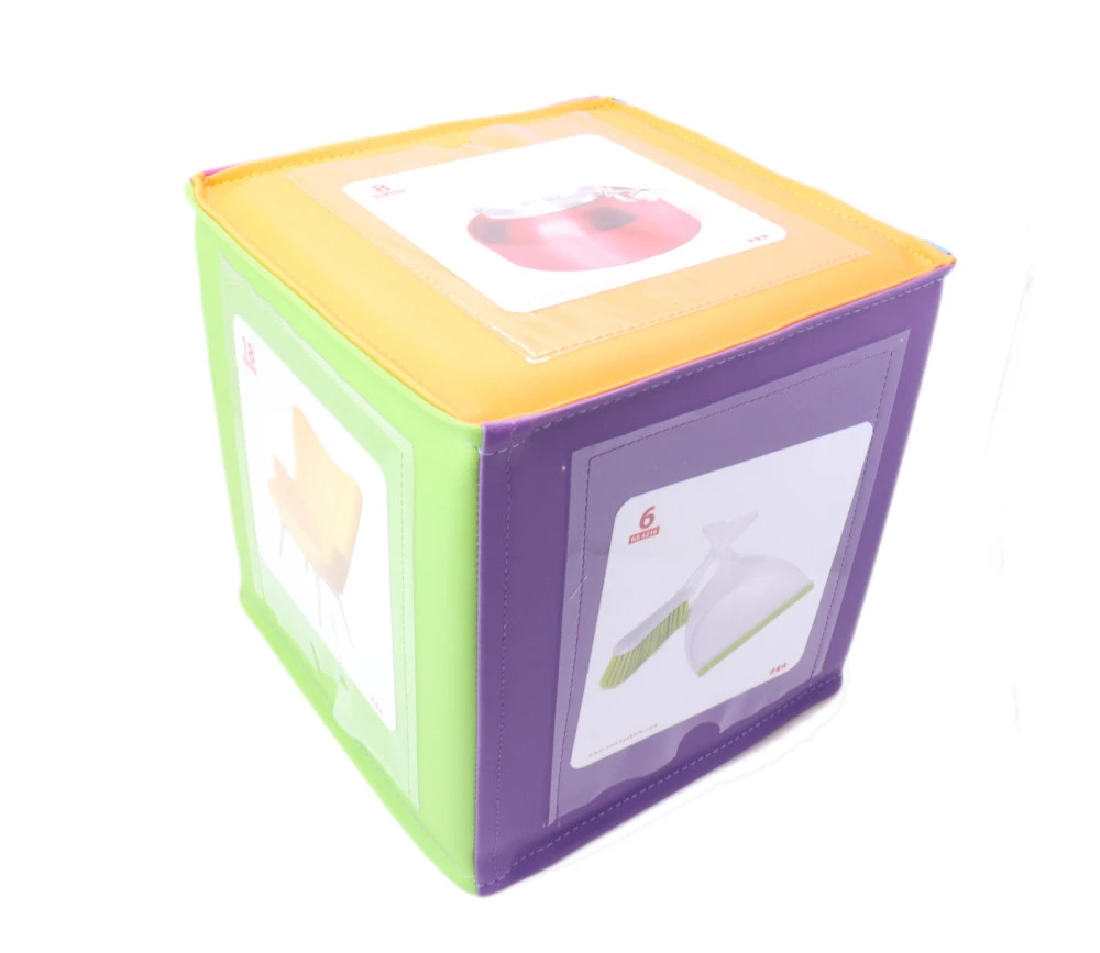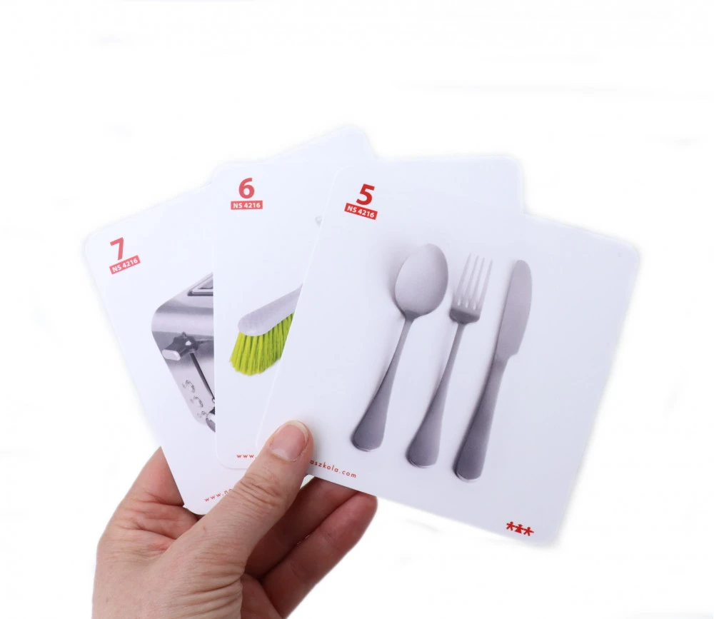 Set de 24 cartes rigides plastifiées 11 x 11 cm illustrées avec des objets de la maison (chaise, tasse, stylo, sèche-cheveux…) avec boite de rangement et sabot.