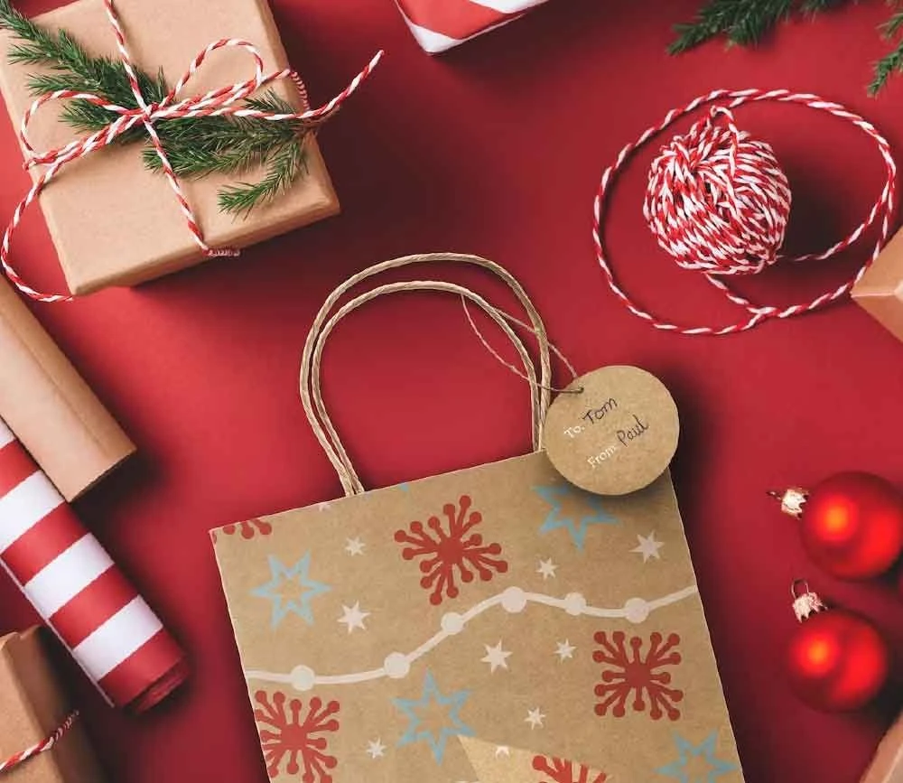 - 24 sacs en kraft décor noël avec anses. Largeur de 18.5 cm. Hauteur 22.5 cm sans les poignées (31.5 cm avec les poignées). Profondeur 8 cm. 6 modèles différents. Etiquettes rondes attachées à chaque sac.