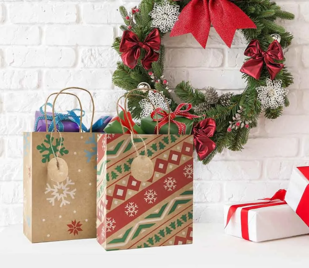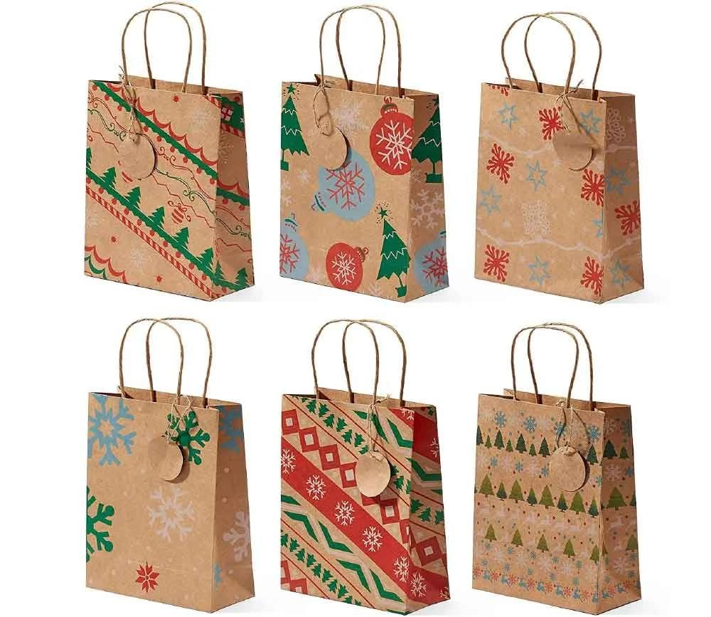 Lot de 24 Sacs en papier kraft décorés sur le thème de Noël livrés vide. Sacs cadeaux pour les fêtes de Noël.