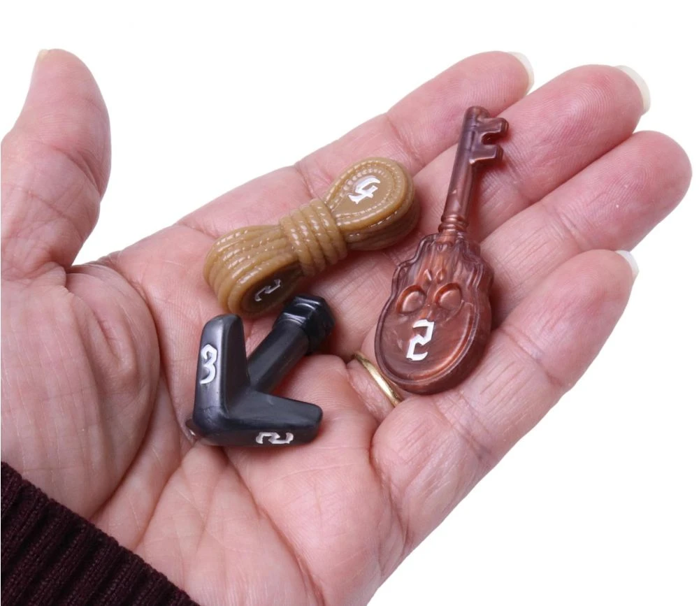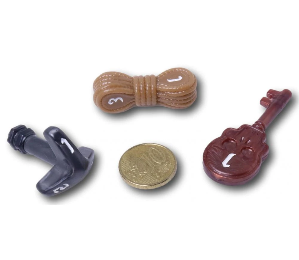 – Le dé 2 faces est une clef avec un anneau en forme de tête de mort, une face et une face 2 en chiffre blanc bien lisible