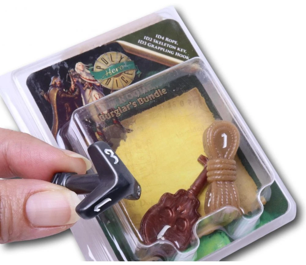 – Le dé 3 faces est une ancre qui peut rappeler celle d’un bateau ou un grappin d’escalade comme un cambrioleur de haut vol pourrait utiliser pour s’évader un chiffre sur chaque crochet défini le chiffre tiré au sort de 1 à 3 c’est celui qui pointe vers le haut qui sera votre score