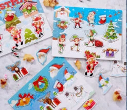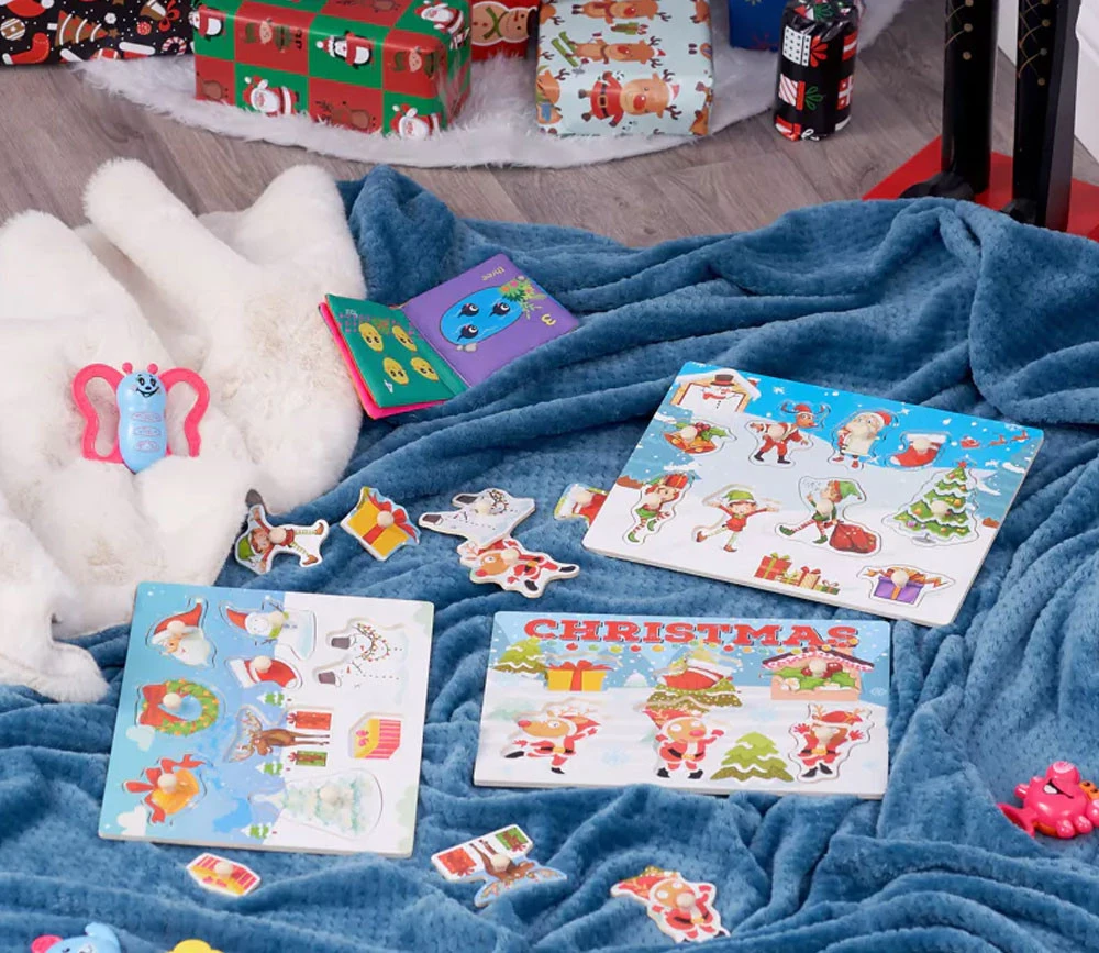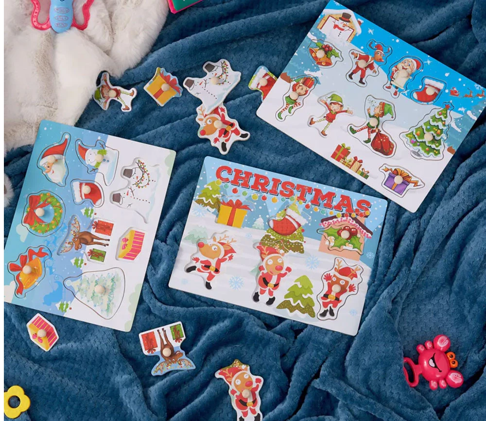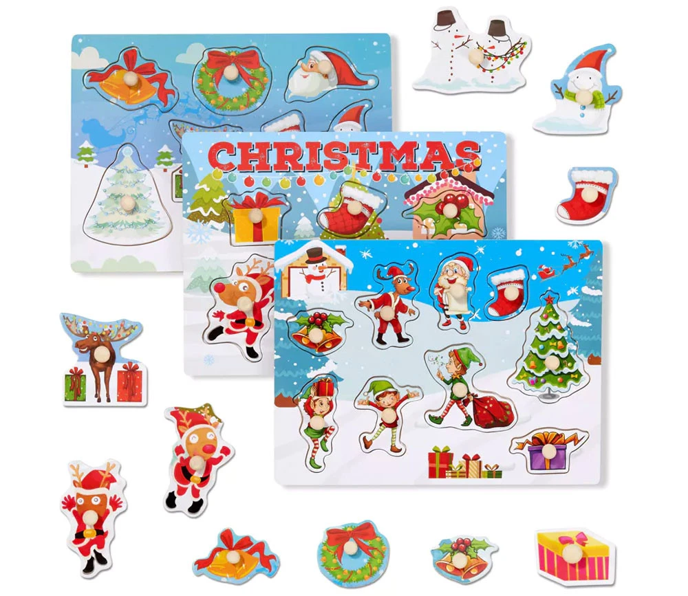 Set de 3 puzzles en bois pour enfant avec pièces boutons sur Noël thème festif.