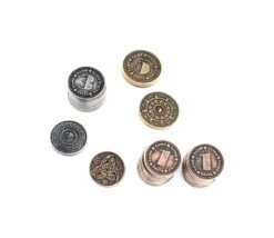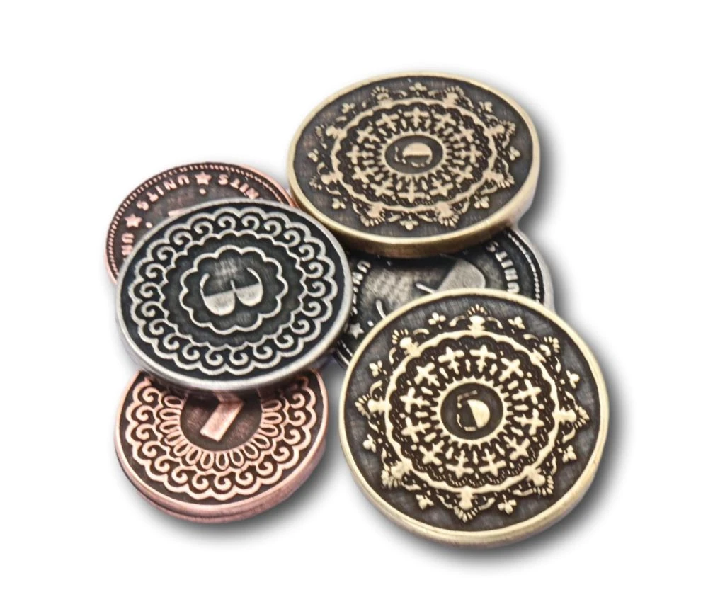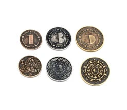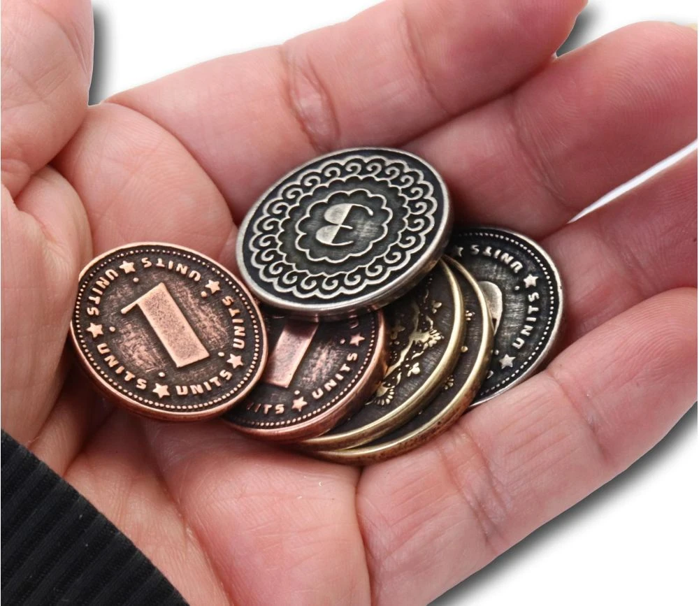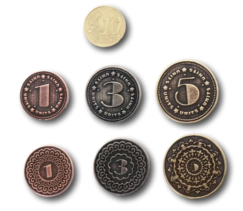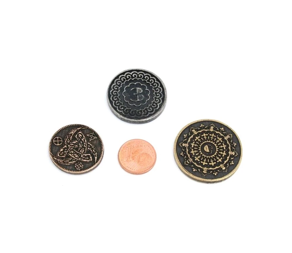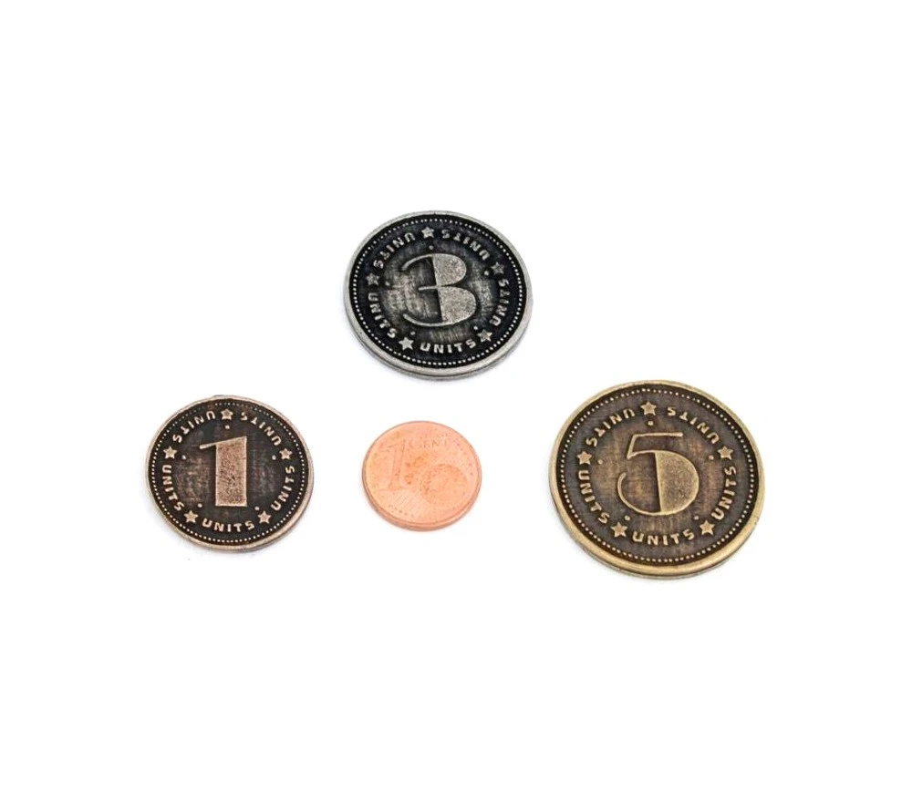 Lot de 30 Pièces en métal pour jeu de société, jeux de rôle ou de stratégie. Coins de 23 à 29 mm de diamètre. Taille et couleur de la pièce en fonction de sa valeur. Superbes pièces métalliques numérotées.