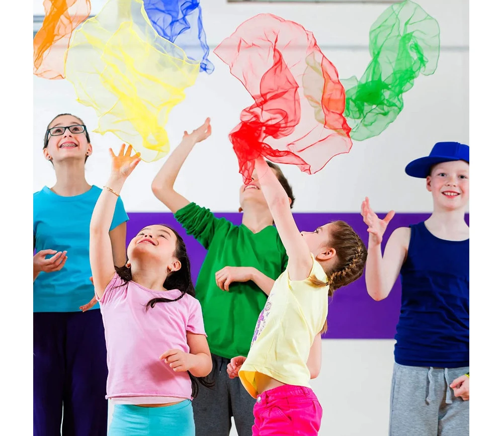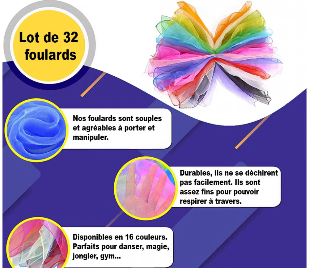 Vos chorégraphies seront lumineuses grâce à cet accessoire de légèreté et de grâce , l’apprentissage de la jonglerie sera plus fun et l’effet arc en ciel des foulards en l’air ravira les spectateurs. Les exercices de motricité pour les personnes affaiblies physiquement seront plus attrayants grâce à ces foulards et leur donnera le goût de la rééducation