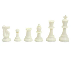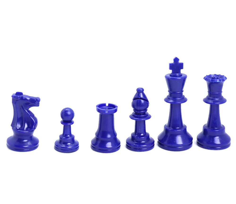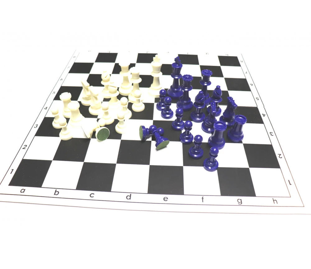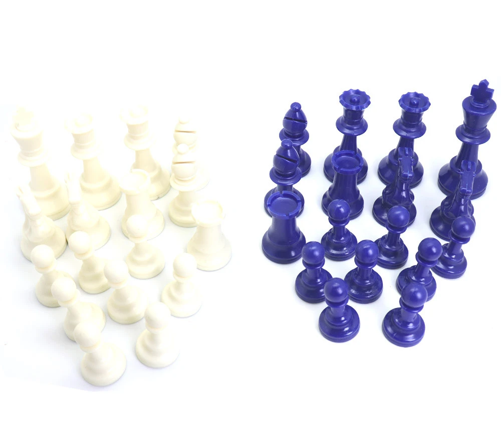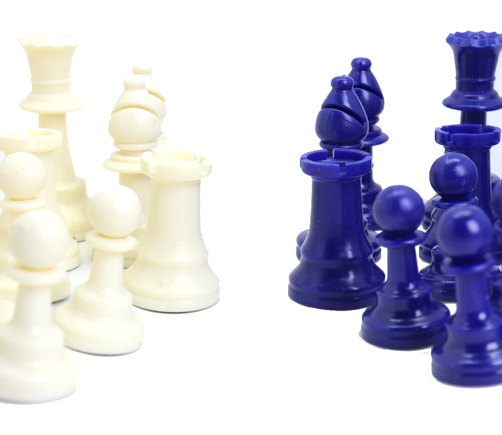 - 32 pions jeu d’échec (16 pièces bleues et 16 pièces blanc-crème).Hauteur du roi 9,7 cm, hauteur d’un pion 4,5 cm. Set de 32 Pions plastique. Feutrine sous les pièces. Pièces échec Staunton 5.