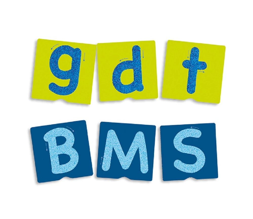 Set de 35 cartes en carton épais coloré avec lettres et signes de ponctuation granuleux pour les découvrir de manière tactile.