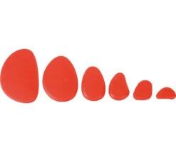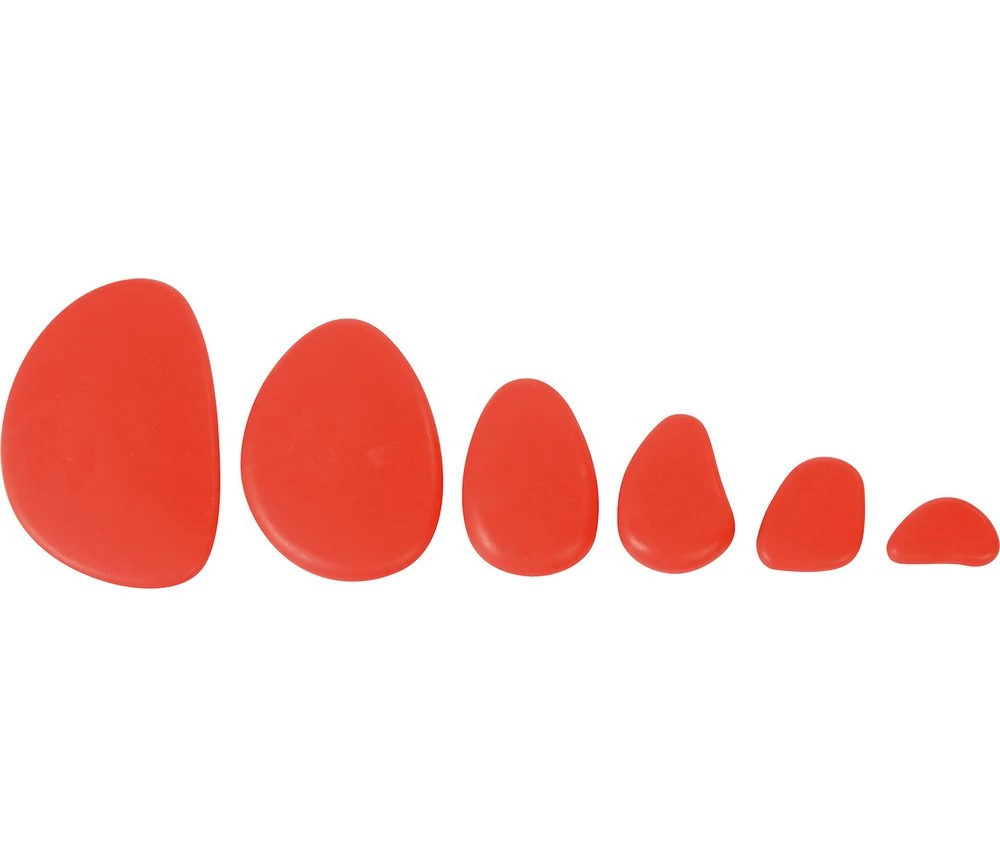 – 36 pions galets plastique avec différentes formes et différentes couleurs : violet, orange, jaune, vert, bleu et rouge. 6 tailles différentes : les grands cailloux environ 8.5 x 5.5 cm et les petits cailloux de 2.8 x 1.7 cm.