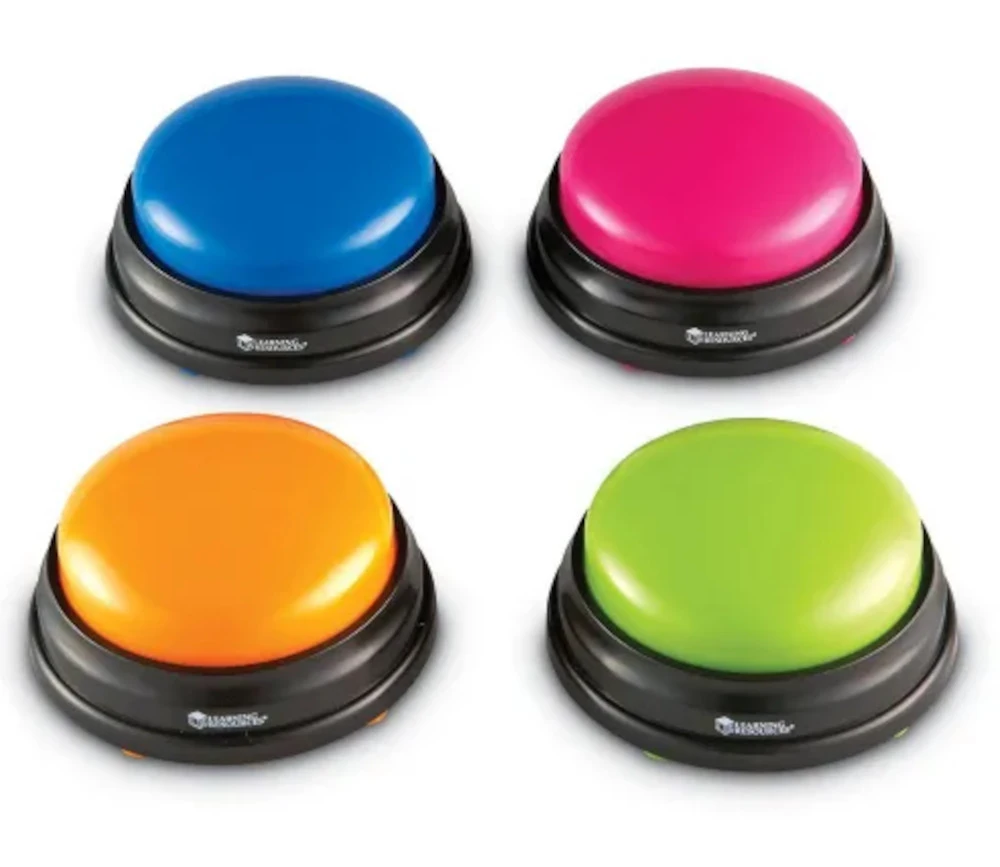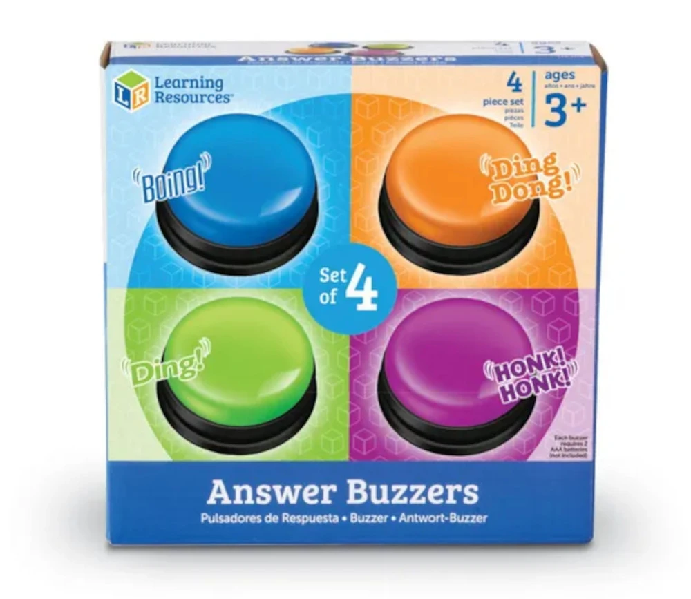 4 buzzers colorés avec des sons différents. Super bouton réflexe pour jouer à des jeux de rapidité, soyer le premier à taper sur le buzzer pour donner la bonne réponse.