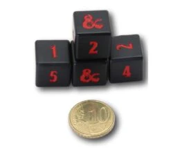 4 Dés en métal teinté en noir mat et gravés en rouge D6 avec les chiffres de 1 à 5 et le symbole & à la place du 6 représenté par un dragon entrelacé en forme d’esperluette issu du célèbre jeu Dungeons & Dragons, l’un des tout premier jeu de rôle de plateau sur le thème médiéval et fantastique.
