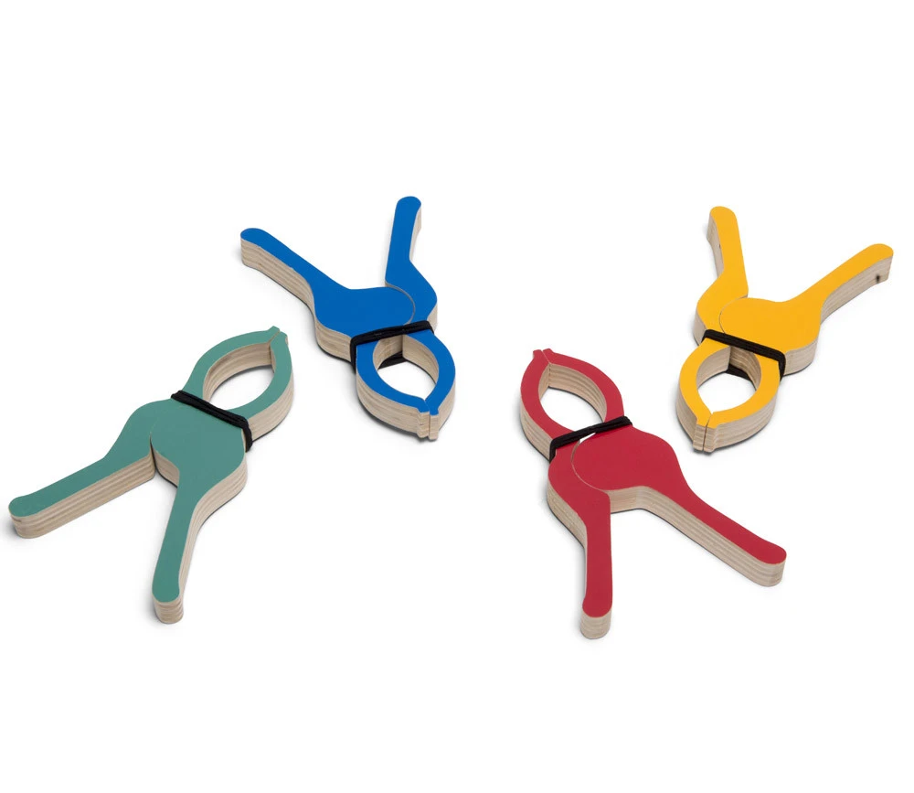 Lot de 4 pinces en bois jaune, rouge, bleu et verte.
