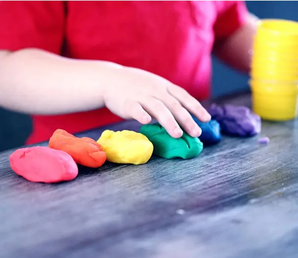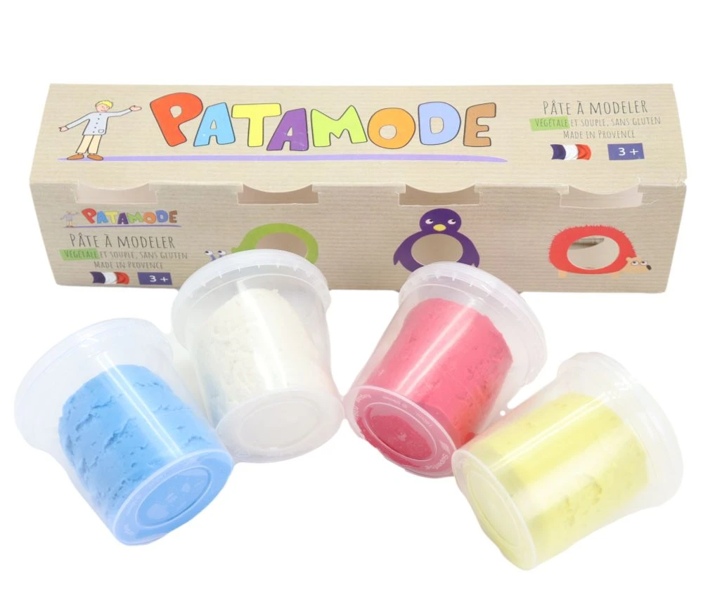 Les couleurs de la pâte à modeler sont les 4 couleurs primaires : bleu, jaune, rouge et blanc.