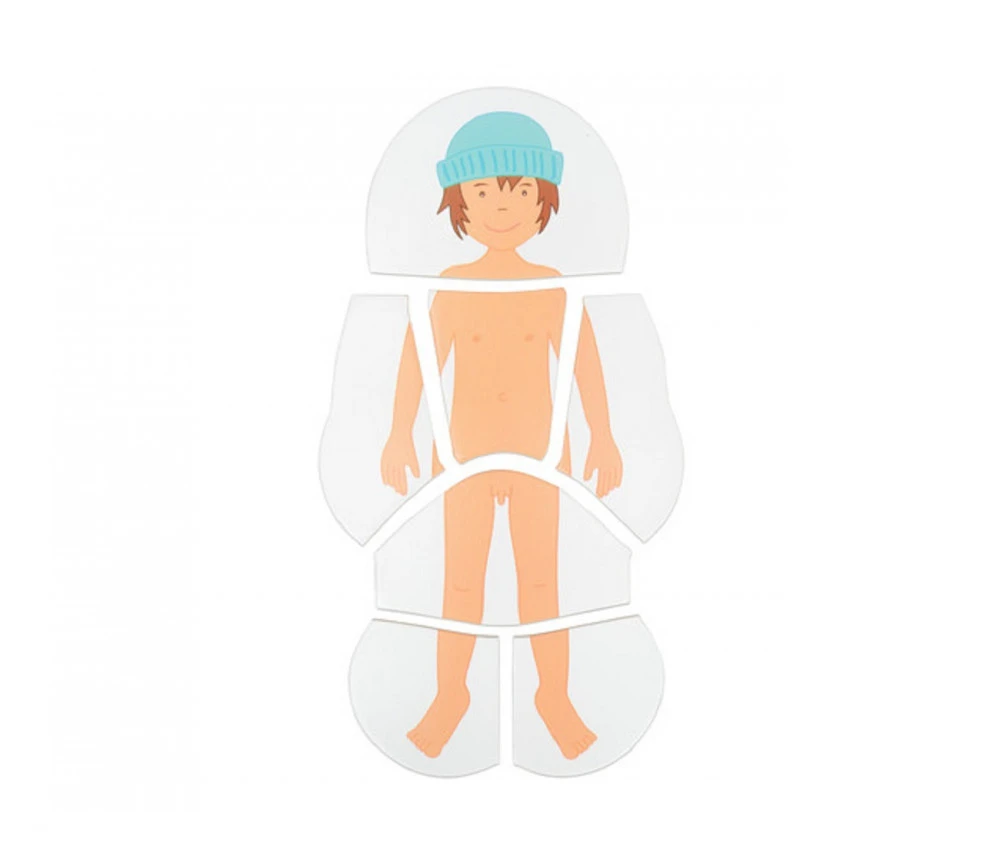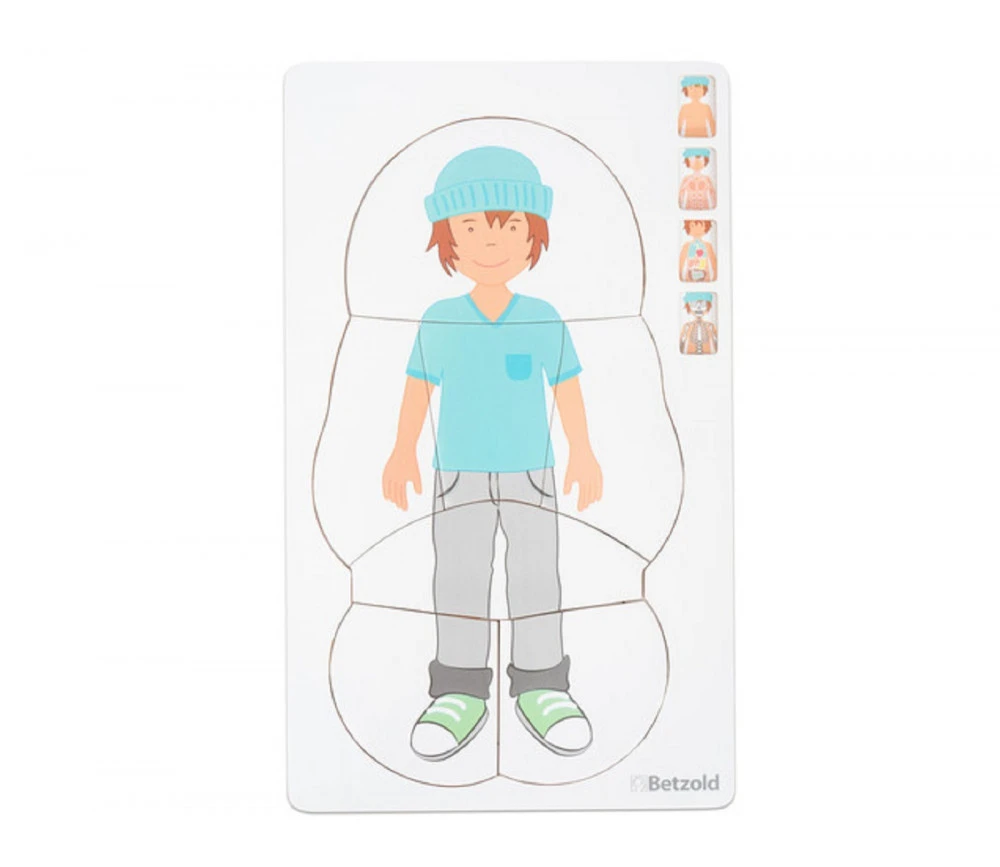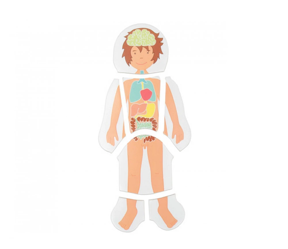 Jeu éducatif pour apprendre à connaitre le corps humain avec des pièces de puzzles à encastrer dans le cadre.