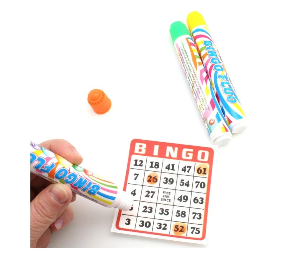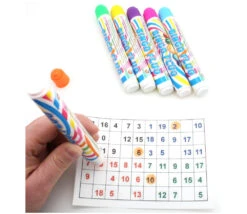 48 Marqueurs pour loto Bingo Pacific Bingo. Ce lot de marqueurs colorés pour vos jeux de loto sont livrés dans une boite de rangement en plastique transparent. Ce set de 48 feutres Feutres pour feuille loto jetable permet de noter les numéros sortis lors de vos jeux de bingo loto. 6 couleurs différentes dans le lot : rouge, vert, rose, orange, bleu, violet.