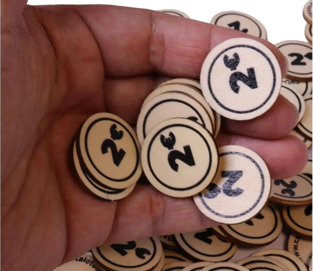 500 Jetons avec le montant de 2 € en bois pour payer dans vos fêtes.