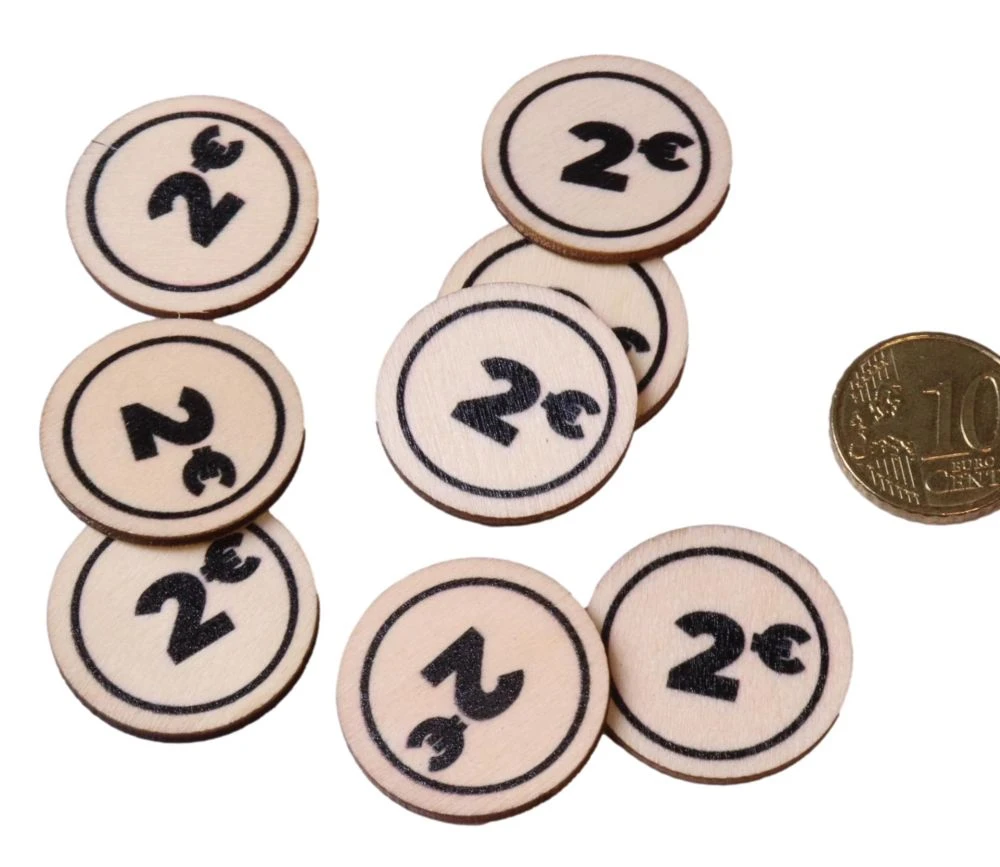 Découvrez nos jetons en bois de 2,5 cm avec une gravure laser précise du montant de 2 € sur la face recto. La face verso possède la numérotation de série pour une identification rapide de la série.