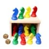 7 pions gris, 7 pions jaunes, 7 pions noirs, 7 pions verts, 7 pions rouges, 7 pions roses, 7 pions violets, 7 pions bleus