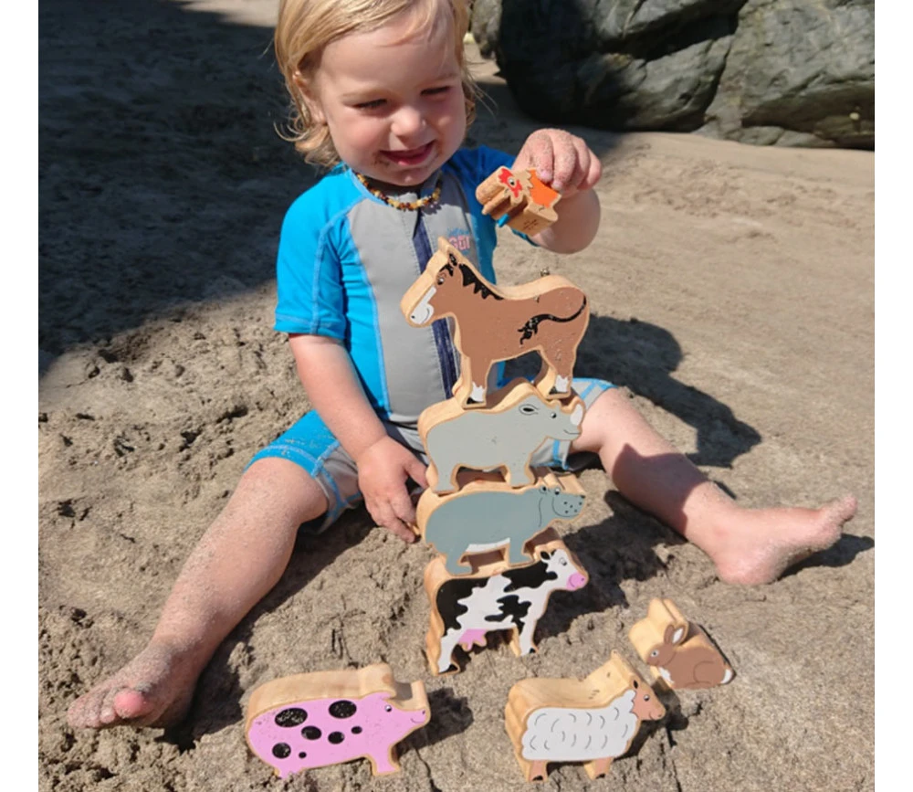 Animaux de la ferme en bois de caoutchouc avec filet de transport.