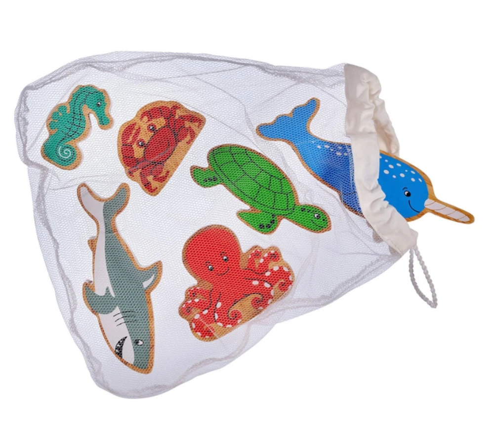 Animaux en bois de caoutchouc avec filet de transport.