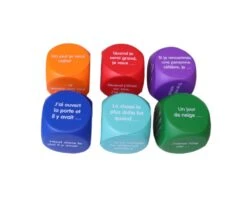 - 6 grands dés en mousse de 4 x 4 cm colorés avec des débuts de phrases différentes sur toutes les faces du dé.