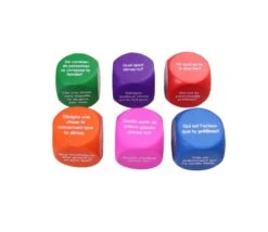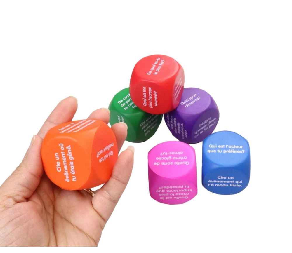 - 6 grands dés en mousse de 4 x 4 cm colorés avec des questions différentes sur toutes les faces du dé.