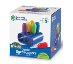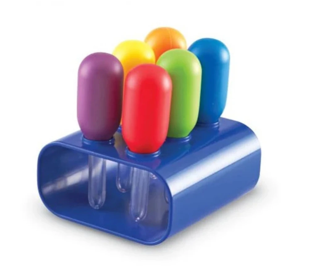 Set de 6 Pipettes géantes Sciences pour les enfants. Support avec 6 pipettes de jeux colorées adaptées à la taille des mains des enfants. Pipette en plastique coloré bleu, vert, orange, jaune, rouge et violet.