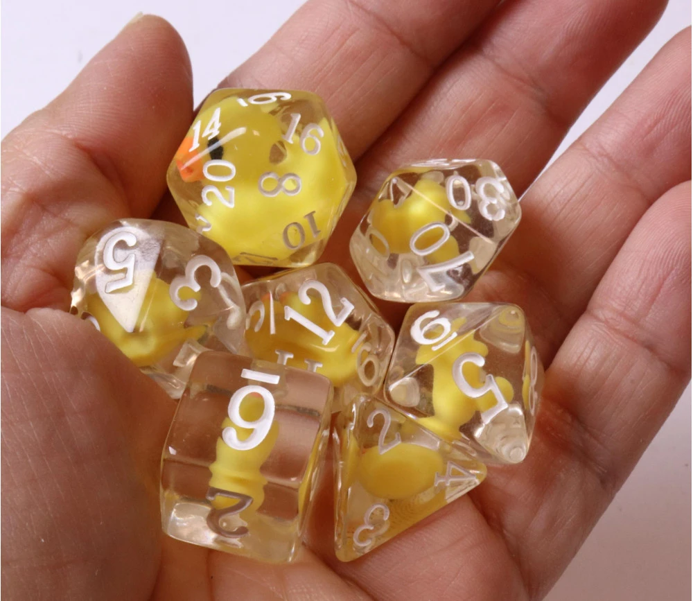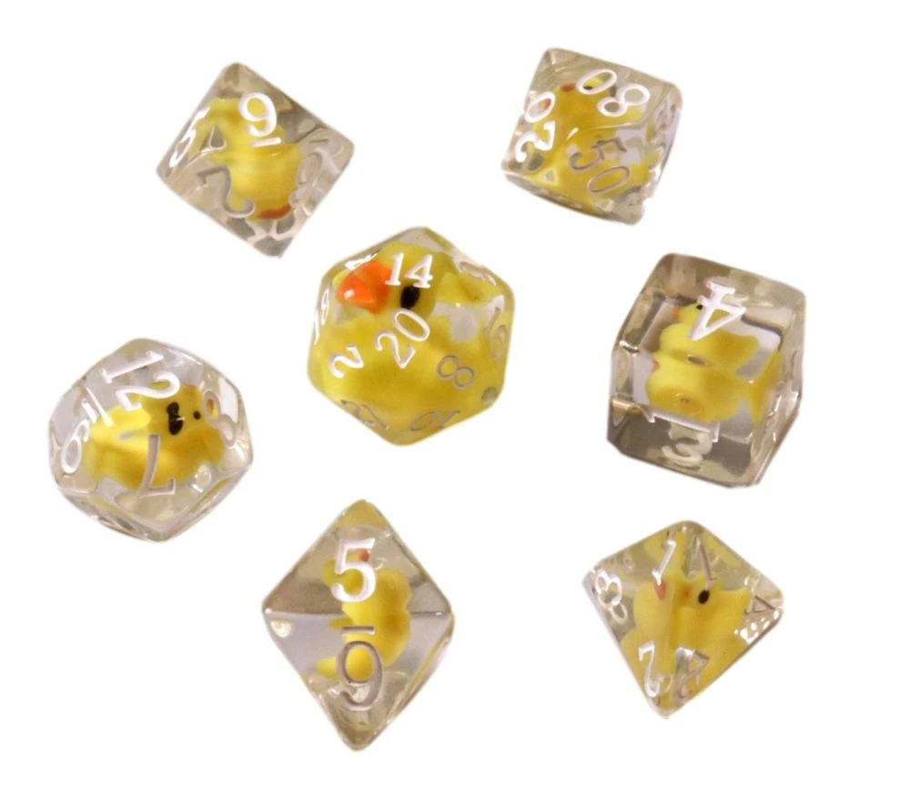 Set de 7 dés multifaces translucides trop drôle avec un petit canard à l’intérieur : coin coin !