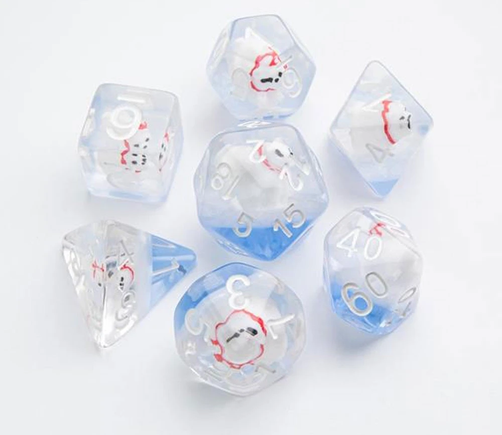 Set de 7 dés multifaces translucides blanc et bleu avec un animal à l’intérieur.
