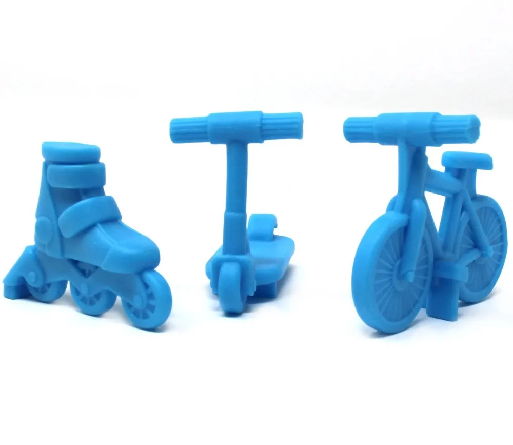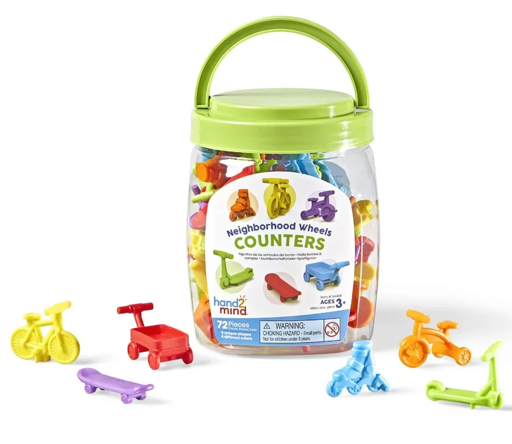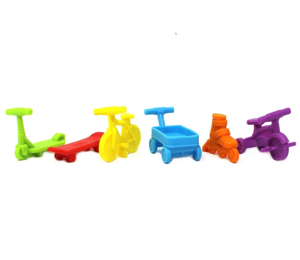 Cet ensemble comprend 6 compteurs différents : scooter, vélo, patin à roulettes, tricycle, planche à roulettes et chariot. Chacun est disponible en 6 couleurs différentes.