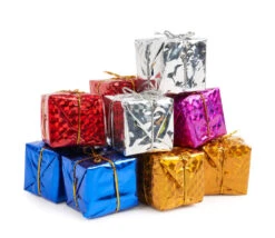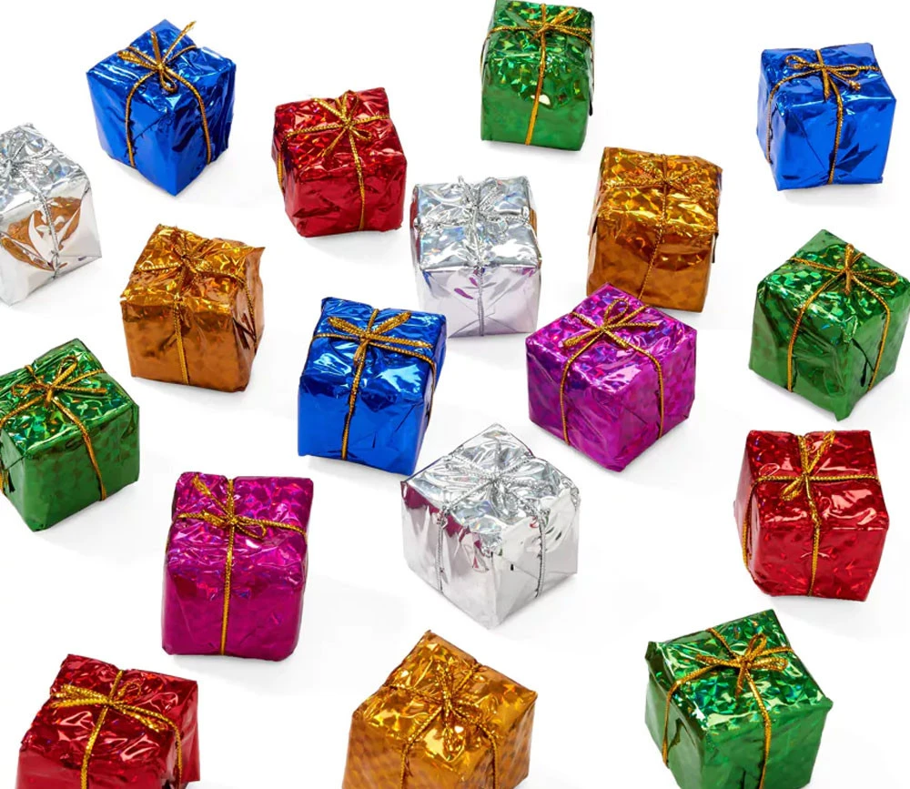 Petits paquets fabriqués à partir de mousse et enveloppés de papier aluminium brillant de différentes couleurs.