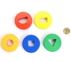 - 15 Rondelles rondes colorées trouées avec des formes, 5 cm de diamètre (1 vert triangle, 2 bleus carré, 3 oranges rond, 4 jaunes rectangle et 5 rouges demi-rond).