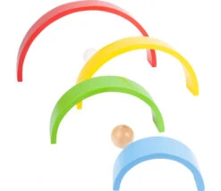 Superbe jeu qui sera aussi une belle décoration en attendant sa prochaine utilisation. Ce set comprend 12 demis arcs de cercle colorés (36 x 18 cm pour le plus grand) + 2 boules en bois (1 blanche et 1 naturelle)