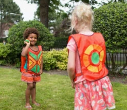 4 gilets avec velcro sur l’avant et l’arrière pour jeu d’adresse et de lancer.