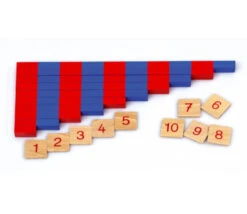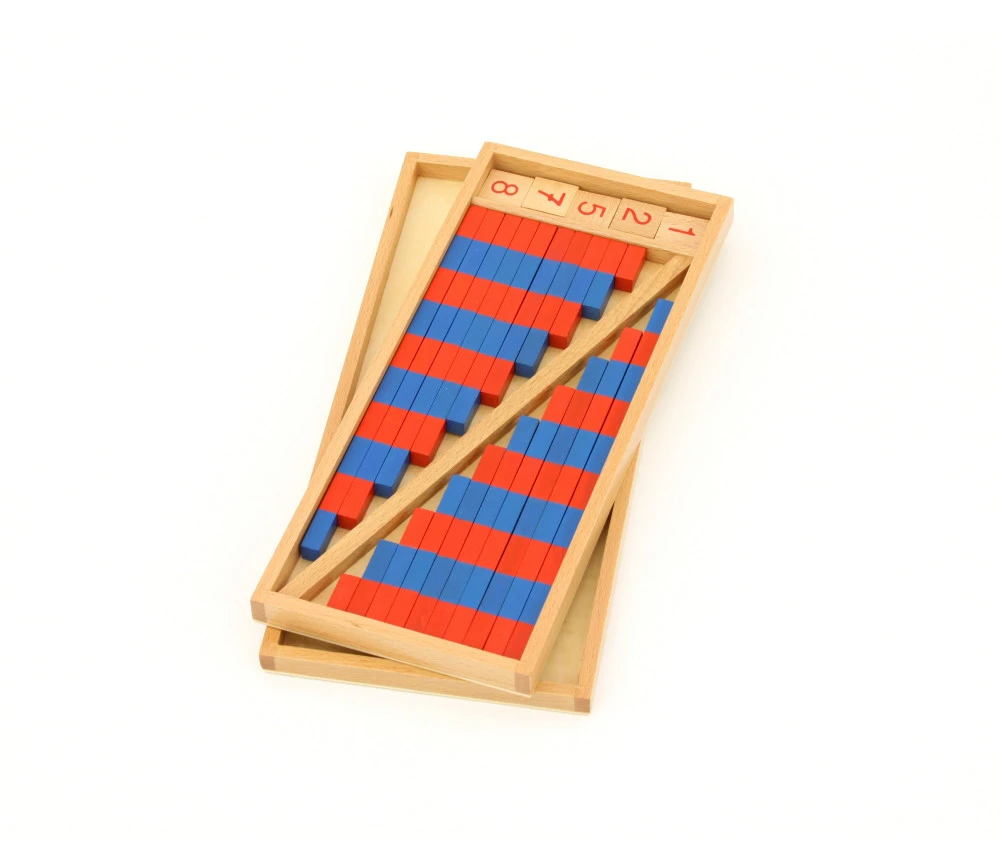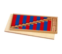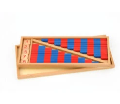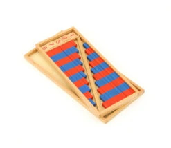 Barres numériques rouges et bleues format plus petit que le standard et 10 tuiles numérotées en bois dans un coffret en bois avec séparation en diagonale.