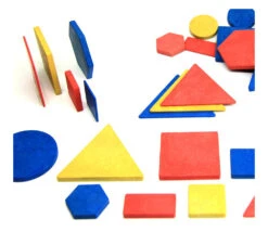 Formes géométriques en bois recyclé pour jeu, taille, épaisseur, couleurs et formes.