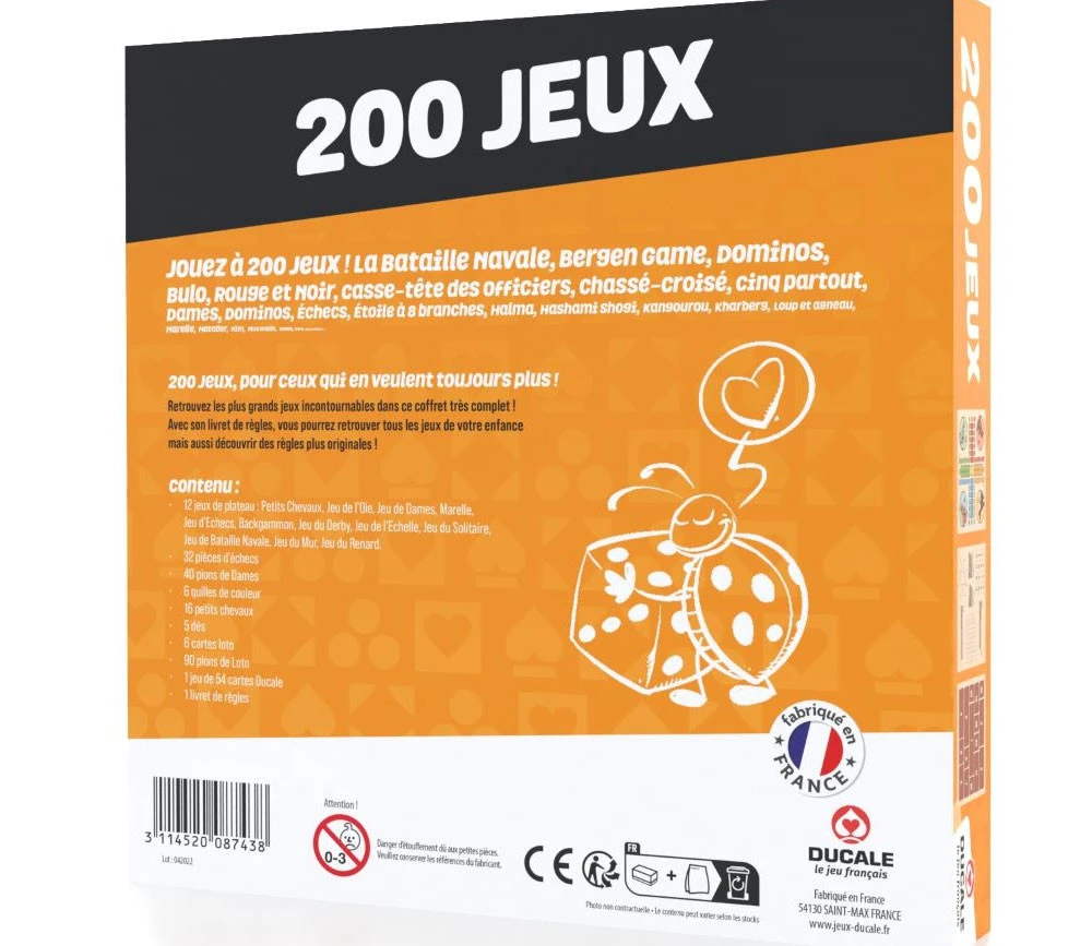 Coffret 200 jeux contenant 12 jeux de plateaux (6 plateaux recto/verso) de 31.5 x 31.5 cm, 6 cartons de loto et tous les pions nécessaire pour les jeux suivants :
