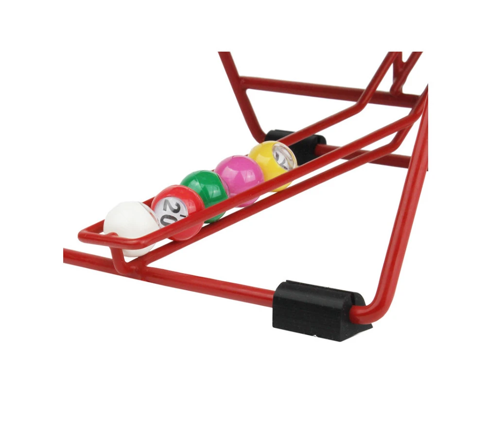 Boulier de loto géant. Un boulier roue en métal rouge idéal pour vos tirage de loto. Grand confort d’utilisation avec la poignée en bois et des patins antidérapants sous les 4 pieds.