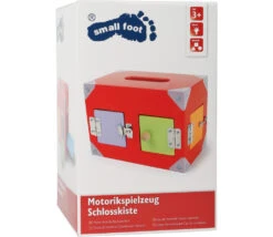 Caisse en bois avec différents systèmes de fermeture : serrure, glissière, clapet. Matériel coloré adapté à la main de l’enfant, exercice de motricité fine. Jeu de motricité découverte.