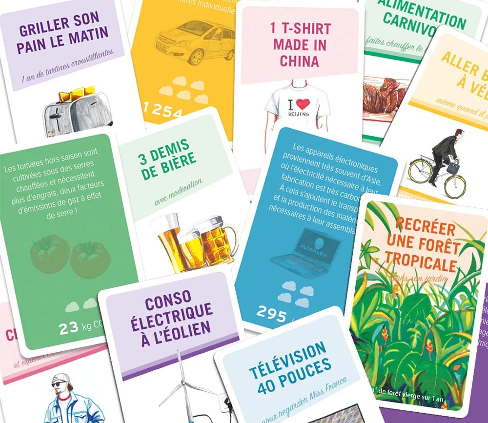 2 types de cartes : cartes annuelles avec bandeau coloré qui représentent les actions de base dont on peut difficilement se passer et les cartes ponctuelles qui représentent des actions supplémentaires qui viennent s’ajouter aux actions de base. Chaque carte représente une action associée à la quantité de CO2 qu’elle émet afin de mesurer son impact (Les chiffres sont issus de réelles données scientifiques)