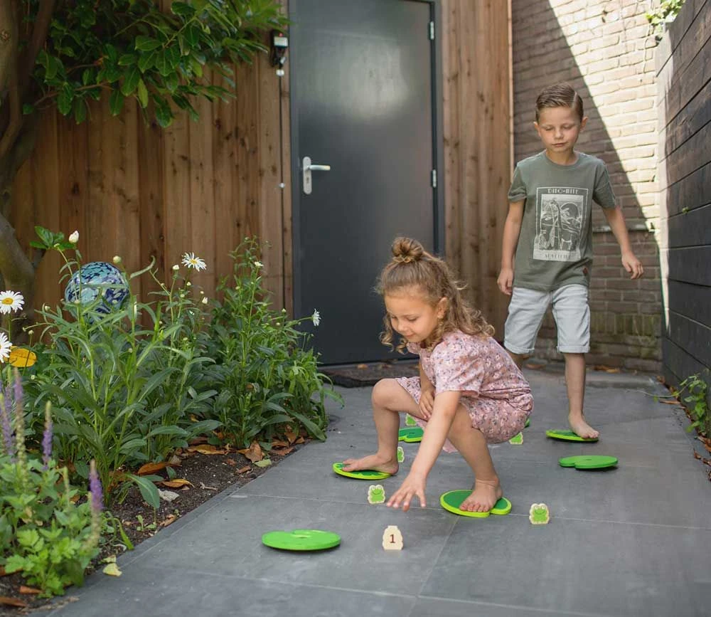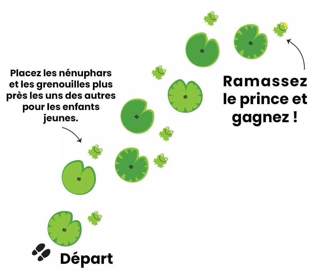 Le joueur ayant la plus petite pointure (de chaussure) commence. Se mettre en position de départ, devant le premier nénuphar. Avancez sur le nénuphar, un pied à la fois. Lorsque vous êtes debout sur le nénuphar avec les deux pieds, prenez la grenouille la plus proche. Continuez jusqu’à ce que vous vous teniez sur le dernier nénuphar. Ramassez le prince grenouille sans perdre l’équilibre pour gagner la partie ! Lorsqu’un joueur perd l’équilibre et marche sur le sol avec son pied, il doit recommencer depuis le début, mais seulement après que tous les autres joueurs aient fini leur tour. Faites la queue pour savoir c’est à qui le tour. Si tous les joueurs sont vraiment bons, faites-en une course, chronométrez-vous et voyez qui sera le plus rapide à terminer le chemin bancal !