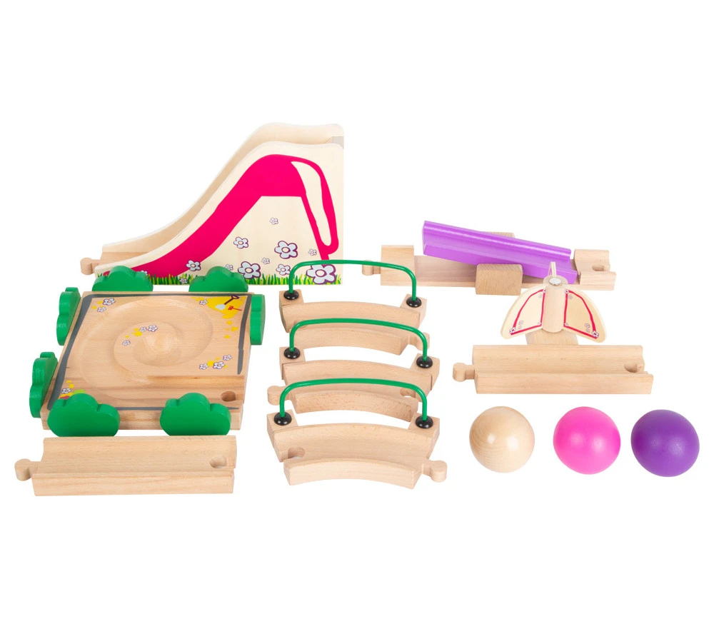 Circuit á boules en bois avec éléments modulaires flexibles sur le thème de l’aire de jeux