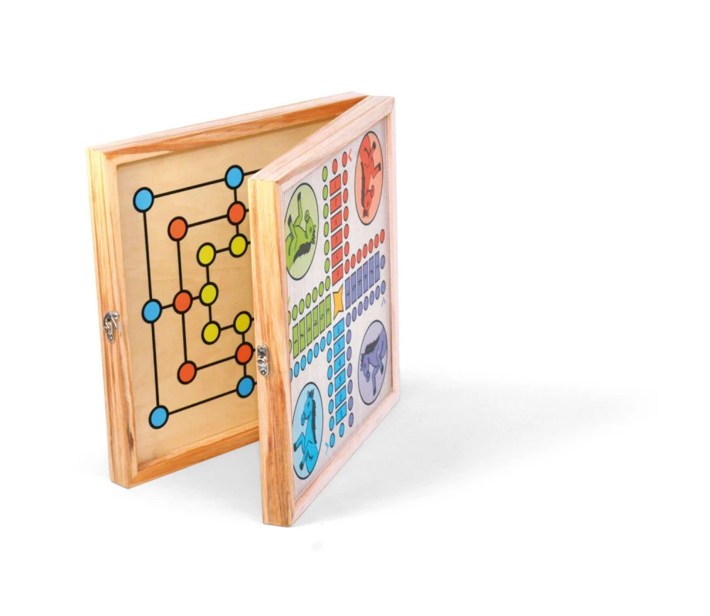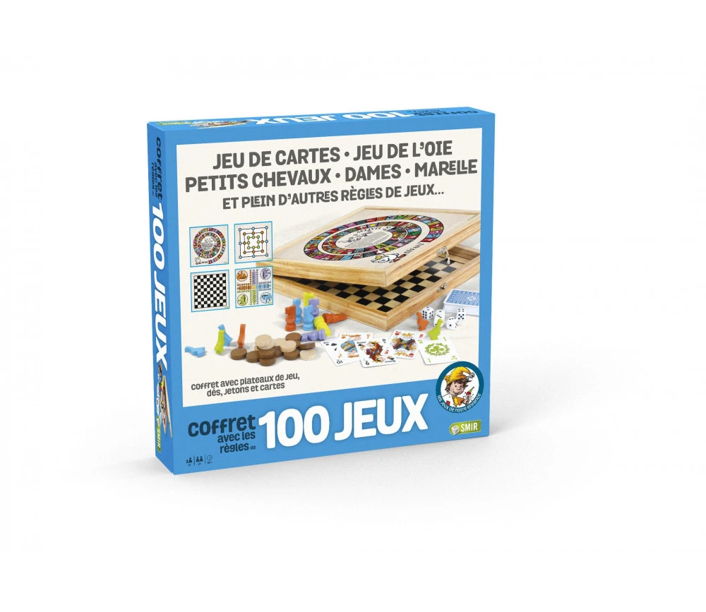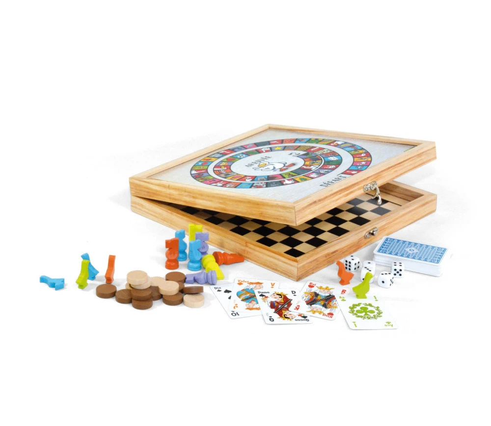 Un grand coffret multi-jeux tout en bois de jeu complet et pratique pour jouer en famille aux grands classiques des jeux de société : dada, 421, crapette, oie, dames, marelle, qui perd gagne, loup et brebis, plus ou moins, le quinze, chicago…