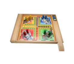 Coffret de jeux tout en bois de 42 x 33 x 4 cm avec 2 partis de rangement sur les côtés pour ranger les pions et dés, une fois la partie terminée.